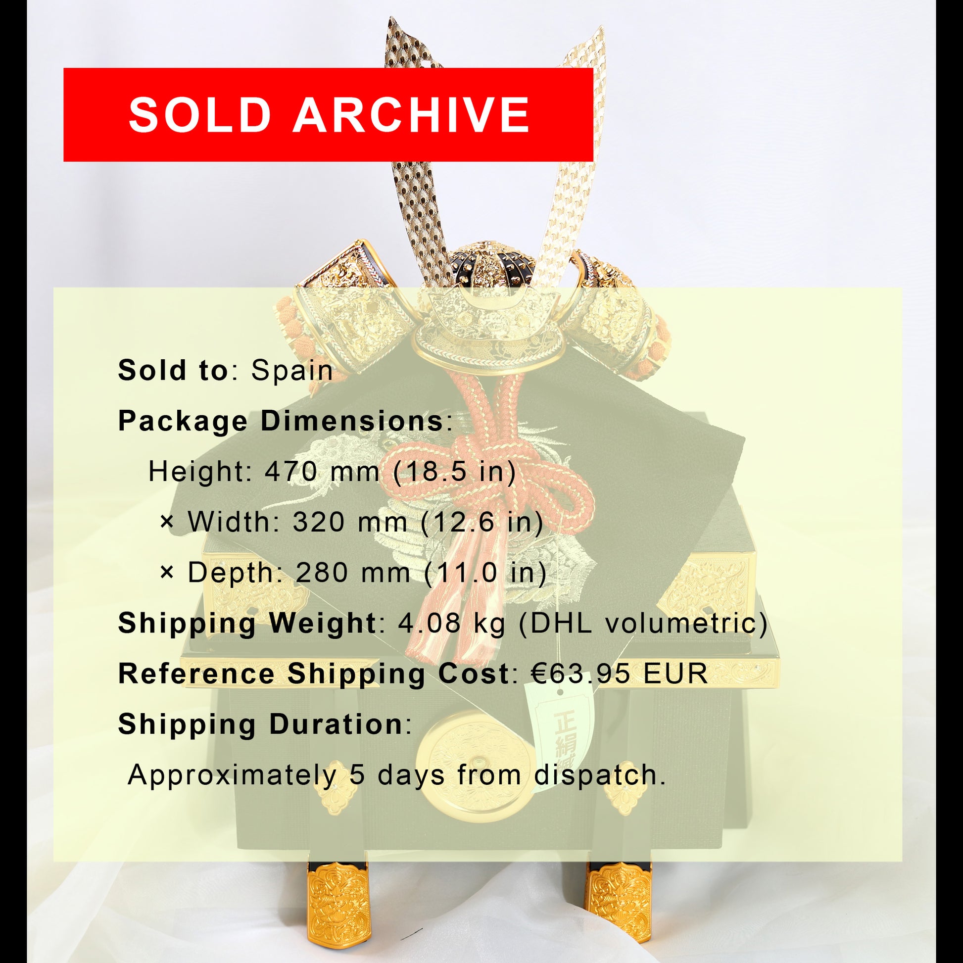 Delivered as a fully assembled display piece, the Kabuto includes a black lacquered base adorned with gold ornaments. Worldwide shipping available.
