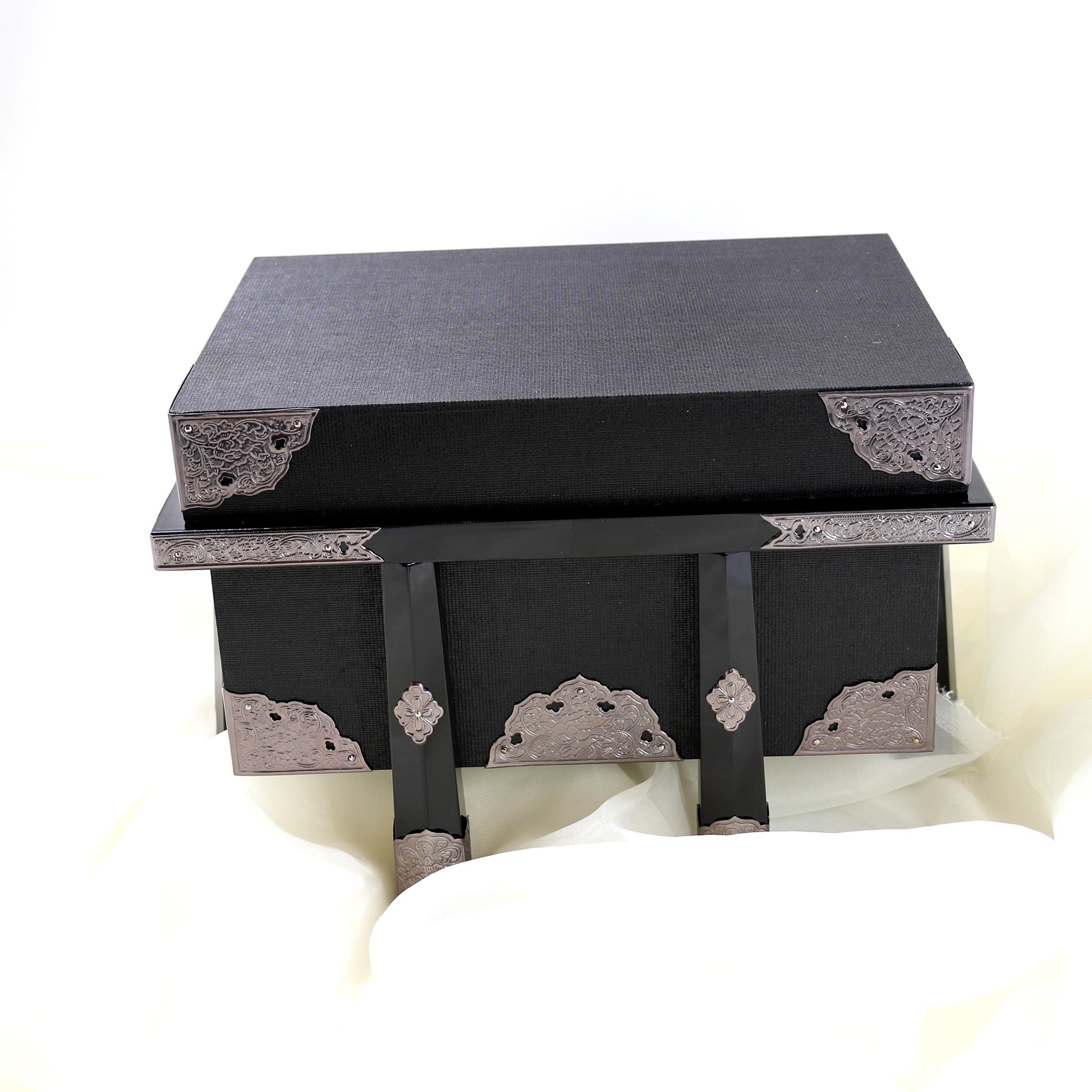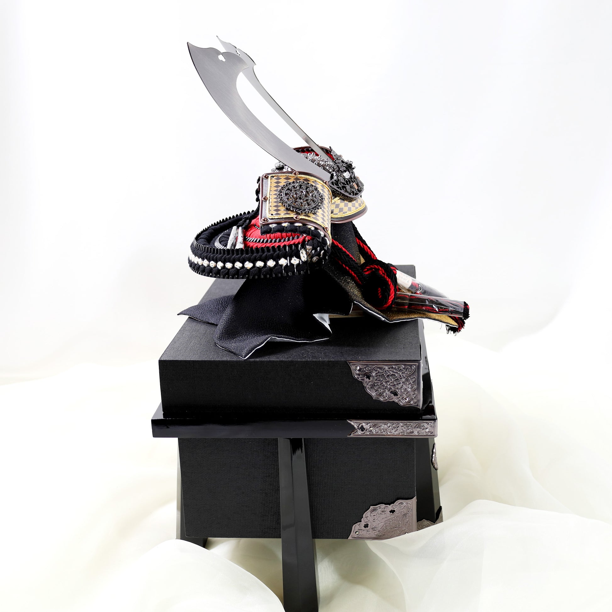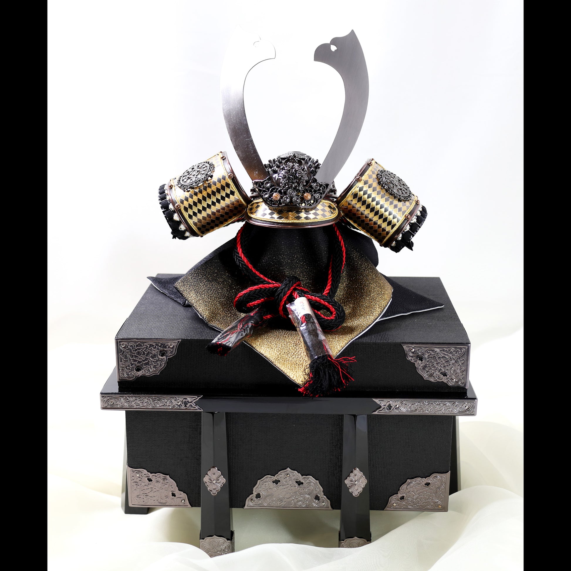 This commanding Kabuto (Samurai helmet) is a sophisticated display piece, embodying the refined aesthetic of the Samurai. Handcrafted in Japan, the helmet features a striking dark metal finish on the hachi (bowl) and sleek, silver metallic kuwagata (crest). The fukikaeshi (side wings) are accented with a bold black and gold checkered pattern, framed by dark lacquered metal and ornate silver-plated relief. The base is an elegant black lacquered wooden chest (ohitsu) adorned with fine silver metal fittings, which provides both a dignified display platform and secure storage. This ready-to-display artifact is a luxurious and historically grounded piece of interior art, offering a quiet strength that appeals to discerning international collectors. Worldwide shipping available.