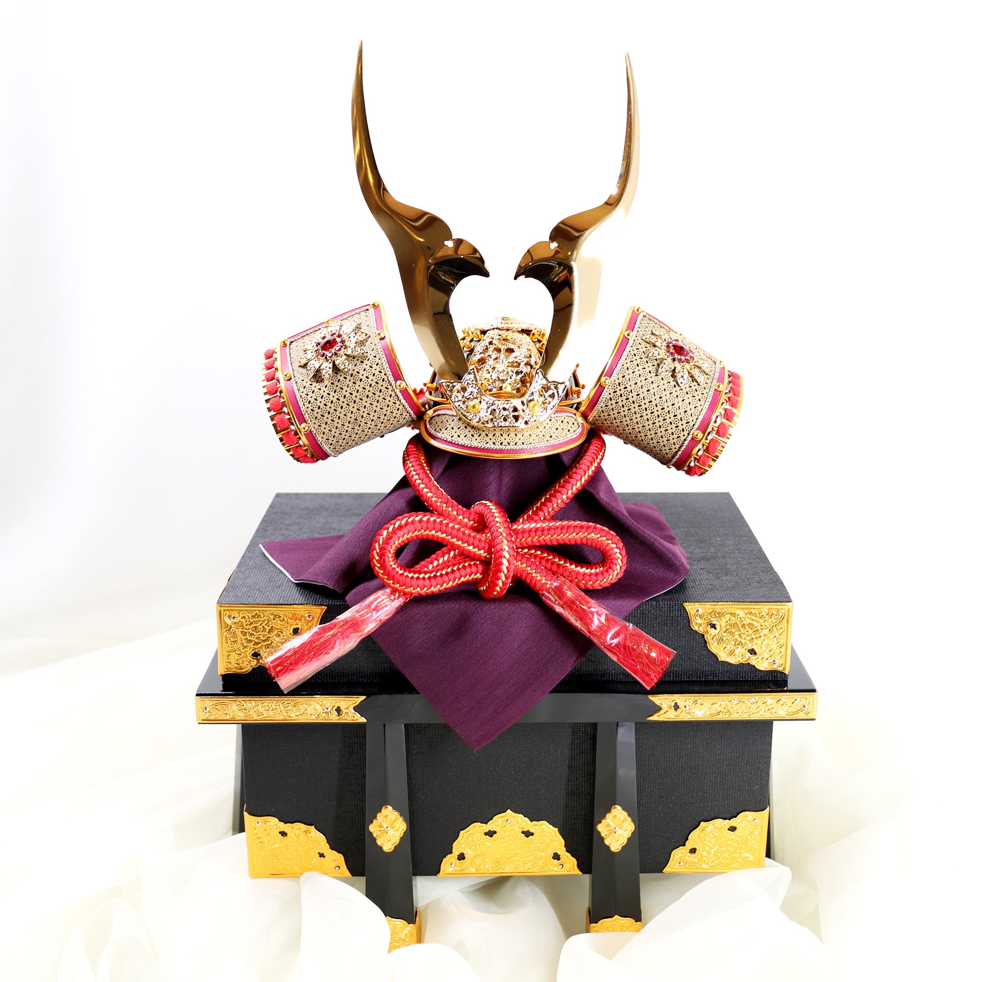 This dazzling Kabuto (Samurai helmet) is an outstanding piece of traditional Japanese artistry. Handcrafted in Japan, it features an impressive pair of highly polished gold kuwagata (antler-shaped crests) that command attention. The side wings (fukikaeshi) and the protective collar (shikoro) are richly embellished with bold red silk cording and intricate gold accents. A notable feature is the embedded faux ruby ornamentation on the fukikaeshi, lending the piece a jewel-like luxury. The helmet rests upon an exquisite black lacquered wooden chest (ohitsu) finished with brilliant gold fittings, which serves as both a stable display base and a secure storage container. This high-value collectible is a ready-to-display statement piece, celebrating historical Samurai elegance and martial spirit. Worldwide shipping available.