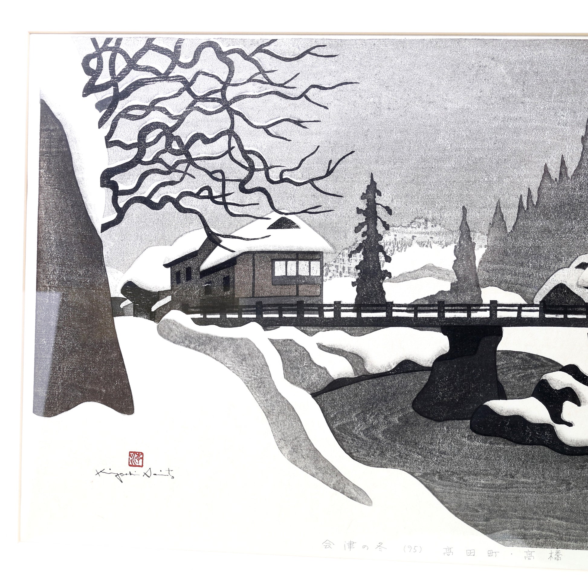 The print masterfully captures a snowy, evocative scene in Aizu, Fukushima, utilizing a sophisticated interplay of black, white, and subtle textures achieved through the wood grain. The composition centers on traditional snow-laden structures and a bridge, conveying a sense of profound stillness and the harsh beauty of a Japanese winter. This piece transcends mere decoration, serving as a powerful, contemplative focal point for any luxury interior.